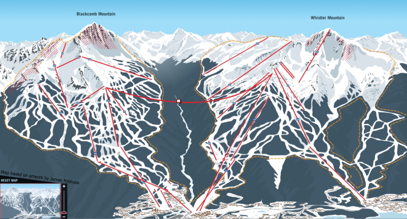 휘슬러 스키 리조트는, 휘슬러 빌리지를 중심으로 오른쪽에는 휘슬러 산, 왼쪽에 블랙콤 산이