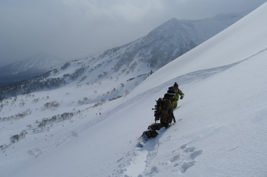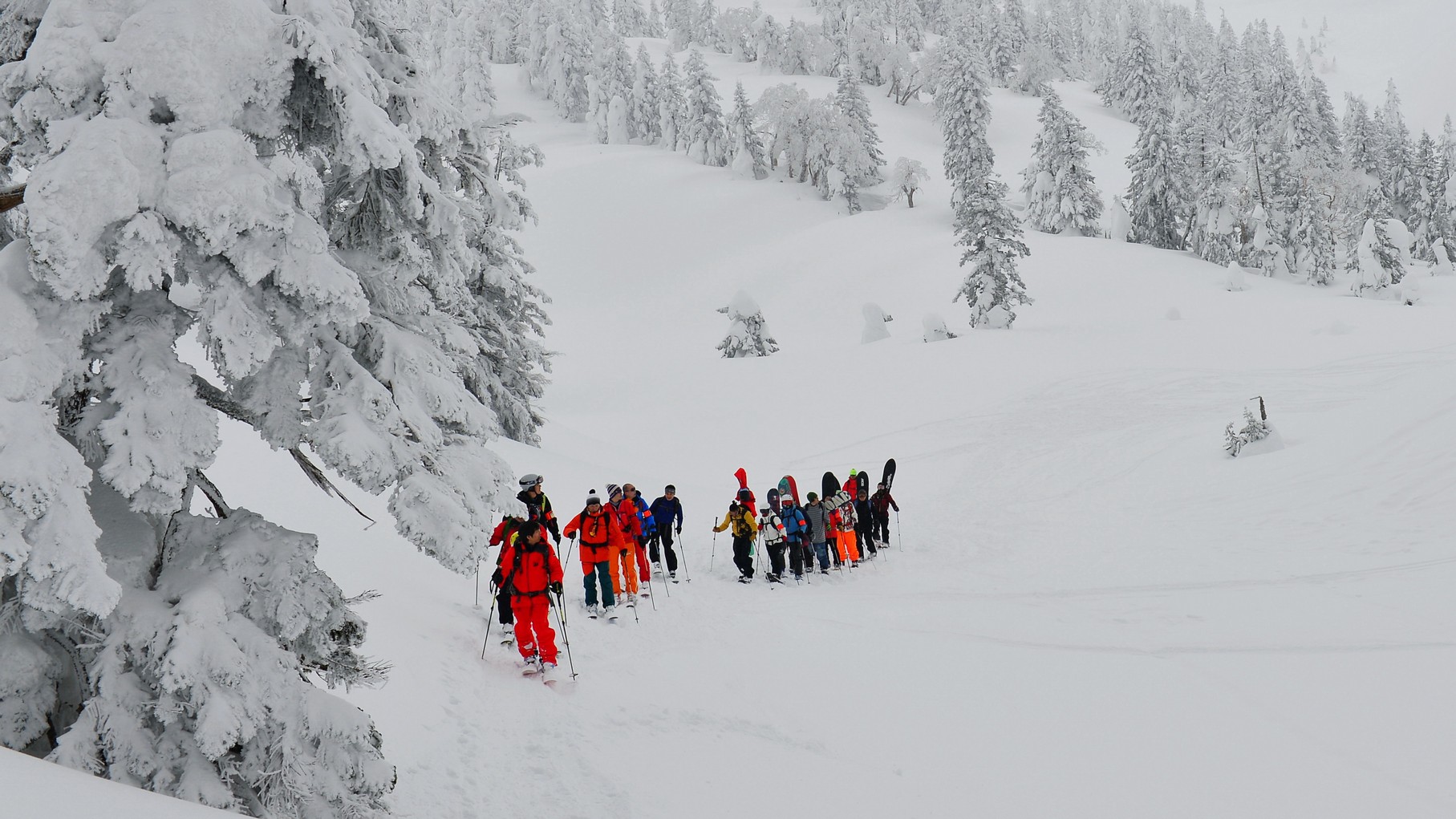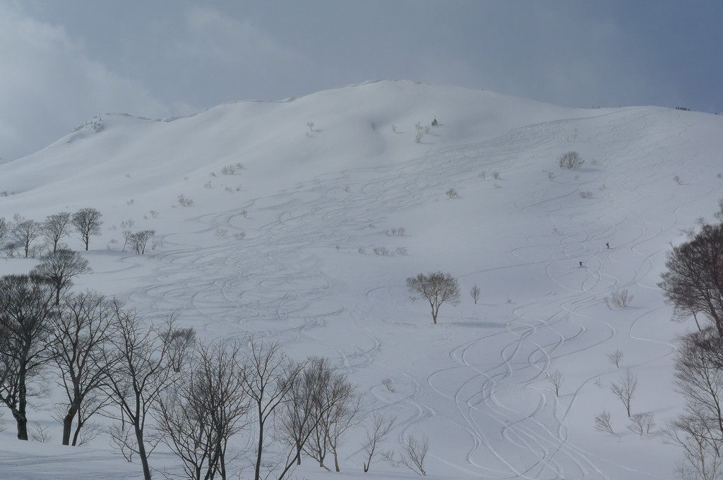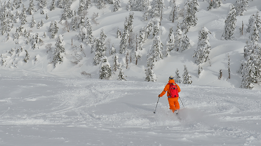 아카쿠라다케의 대사면 하단부로 단 한번의 라이딩을 위해 산을 넘고 넘어 마음껏 파우더 사면을 활강하는 느낌은 표현 할 수 없을